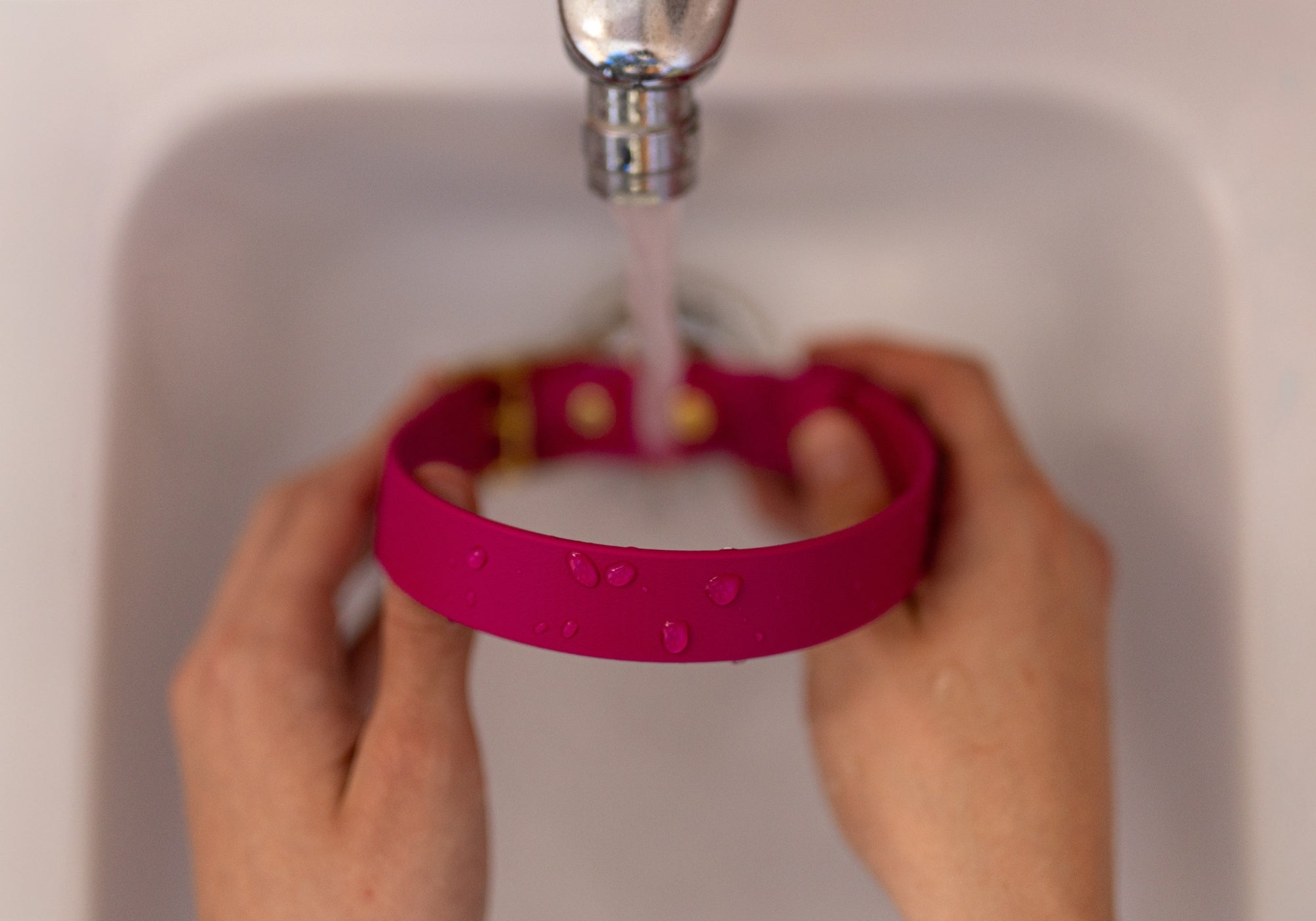 Vsako ovratnico individualno personaliziram: ime tvojega kužka natančno vtisnem s postopkom toplotnega žigosanja, ga ročno obarvam v treh premazih, nato pa še zaščitim z vodoodpornim zaključnim slojem, ki zagotavlja dolgotrajno obstojnost in vodoodpornost.